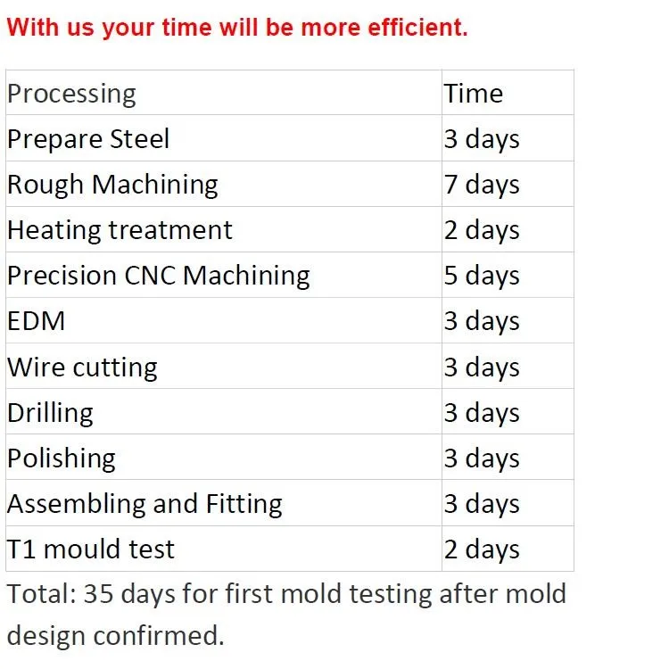 As long as your relevant departments can cooperate with us to complete all the processes, the product may have problems with detection and preparation, mold-related information (mold size, injection cycle, injection difficulties, product weight, nozzle weight, pickup method, the cooperation of the robot Requirements, etc.), T0 (first tryout) time, estimated delivery time, etc. are all within your precise control.